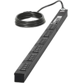 Vertical switched power strip with per outlet power and environmental monitoring, 30 A, 120V, 24 NEMA 5-15R receptacles, red LED current monitor, RJ-45 Ethernet port with two RJ12 remote environmental ports, two 20 A double pole magnetic breaker on-off switch with integral switch guard, and 10' power cord with NEMA L5-30P twist lock plug. UL and c-UL Listed. Dimensions: 70.0"H x 2.5"W x 2.3"D Breaker Doghouse add 1.44" (87.4mm) to overall depth (1778mm x 64mm x 57mm)
